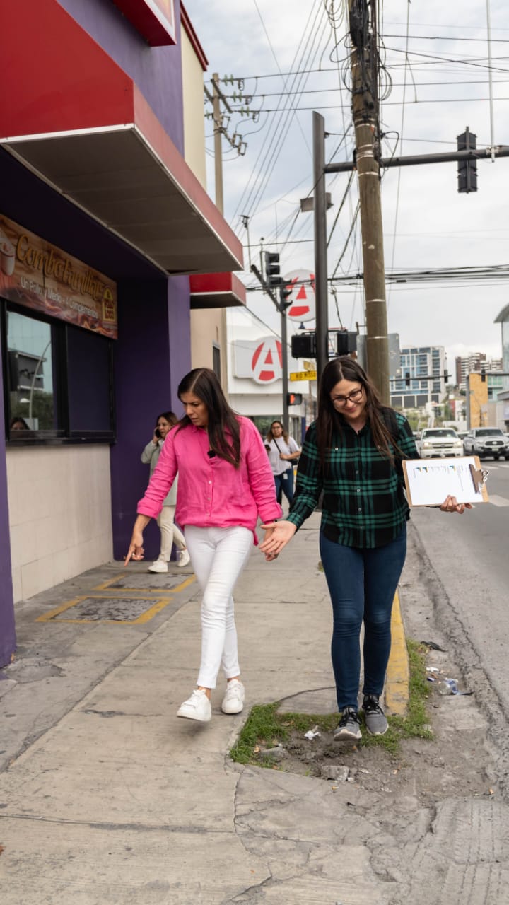 Lorenia Canavati y Luisa Peresbarbosa, recorrieron la avenida Gómez Morín desde Río Savotino hasta Vasconcelos, uno de los principales accesos al municipio, y en donde pudieron constatar riesgos para los peatones como la falta de cruces seguros, semáforos peatonales descompuestos, ausencia de banquetas y obstáculos como cables sueltos, alcantarillas destapadas y anuncios (mupis).