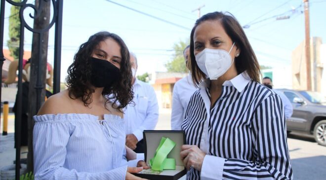 La Alcaldesa felicitó a Hannia Paola Morales Guzmán, Ana Luisa Carrillo Gaytán, Deborah Casco Gaona, Angélica Nohemi Villa Mora y Fernanda Aguilar Rojo, quienes al igual que el político y economista sonorense, Luis Donaldo Colosio, son alumnas de 10.