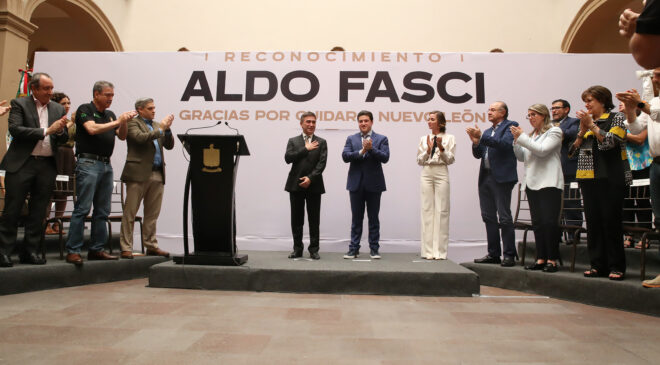 - “Si hoy Nuevo León está blindado y mejor que otros estados, es por hombres y mujeres de estado como Aldo Fasci”, comentó.