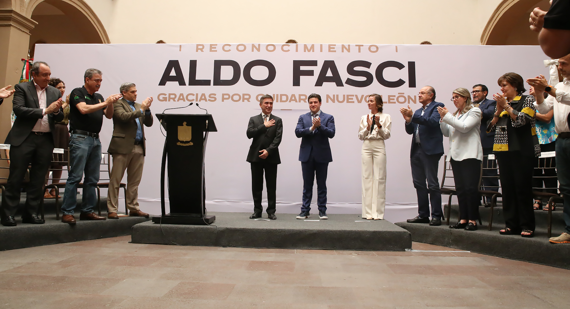 Al reconocimiento a Aldo Fasci asistió su familia, así como funcionarios del Gabinete Central y Ampliado, y funcionarios estatales, federales y municipales integrantes de la Mesa para la Seguridad de Nuevo León.