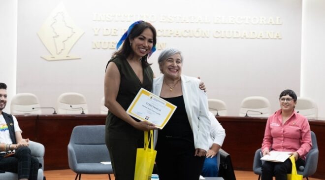 En el evento estuvieron las Consejeras Electorales del IEEPCNL, Martha Magdalena Martínez Garza y María Guadalupe Téllez Pérez; y el Secretario Ejecutivo del organismo, Martín González Muñoz.