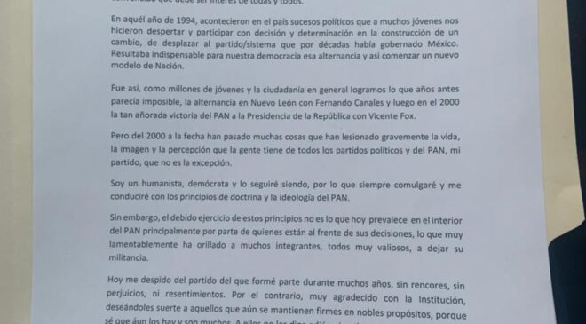 “Sin embargo, el debido ejercicio de estos principios no es lo que hoy prevalece en el interior del PAN principalmente por parte de quienes están al frente de sus decisiones, lo que muy lamentablemente ha orillado a muchos integrantes, todos muy valiosos, a dejar su militancia”, expresó.