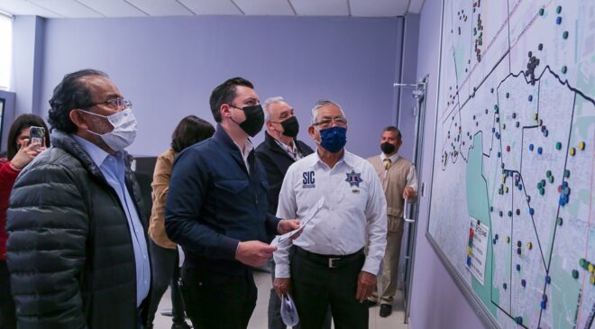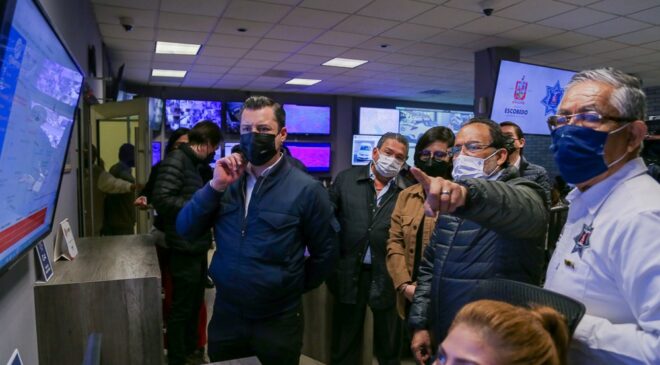 El Alcalde de Escobedo, Andrés Mijes, recibió a su homólogo de Monterrey, Luis Donaldo Colosio, Secretarios de Seguridad y otros funcionarios de ambos ayuntamientos para recorrer las instalaciones de la Secretaría de Seguridad Ciudadana de Escobedo, principalmente las salas de audiencias de Justicia Cívica, Tribuna Vial, C4 y el área de Investigación y Análisis.
