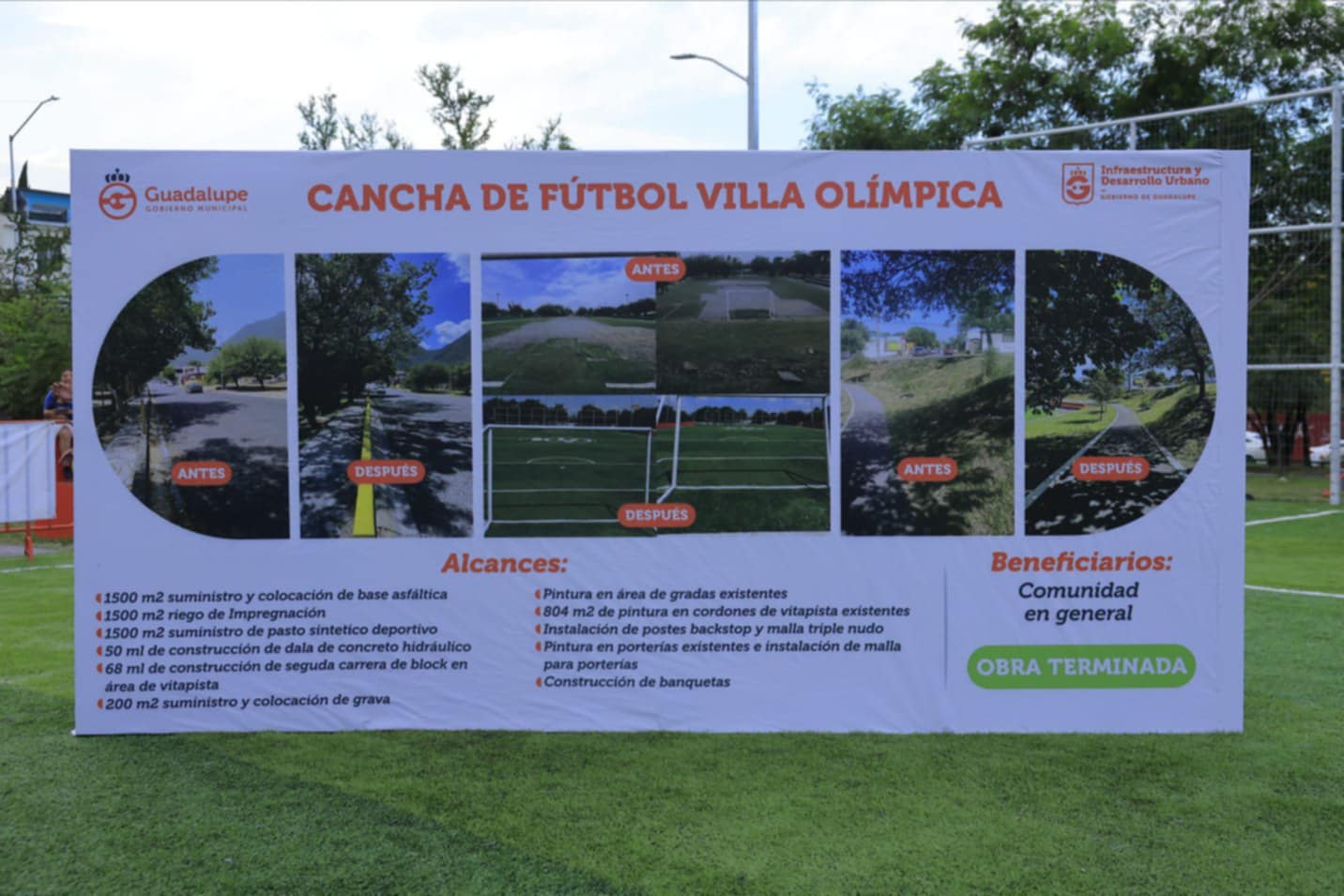 En beneficio de miles de niños y jóvenes que practican deporte, el alcalde de Guadalupe, Héctor García entregó la rehabilitación integral de la cancha de futbol en la colonia Villa Olímpica.
