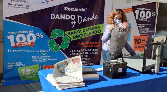 Los ciudadanos pueden aprovechar los materiales que desecharon durante las fiestas navideñas y de fin de año, por lo que el Gobierno Municipal que encabeza el Alcalde Héctor Castillo continuó con el programa “Dando y Dando, Santa Catarina Reciclando”, mediante el cual las familias realizan el pago del catastro con PET, periódico, latas de aluminio, baterías de autos, cartón y otros materiales de reuso.