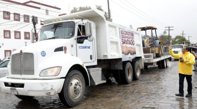 Con el apoyo de las empresas locales, se destinó siete retroescabadoras, dos pipas de agua de 10 mil litros de capacidad, mil botellas de agua potable, las cuales llegaron hasta la base de Protección Civil de Santiago, donde fueron recibidas por el Alcalde David de la Peña.