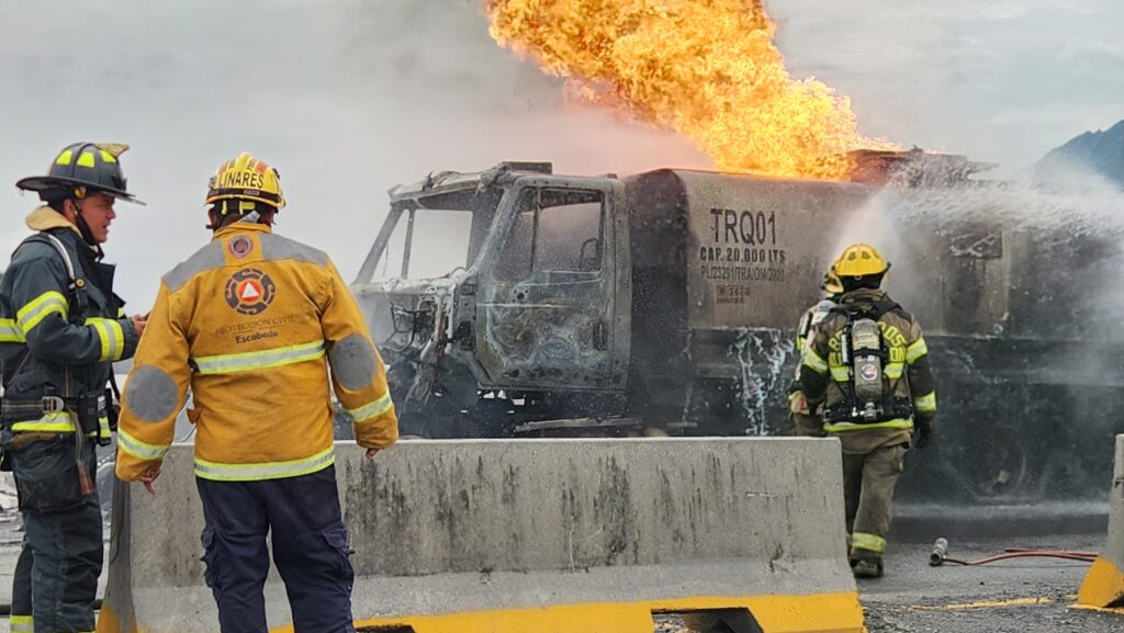 El Gobierno Municipal de Escobedo informó que esta tarde se registró la explosión de una pipa cargada con diésel en el paso a desnivel ubicado entre Libramiento y Camino a las Pedreras en su sentido norte sur.