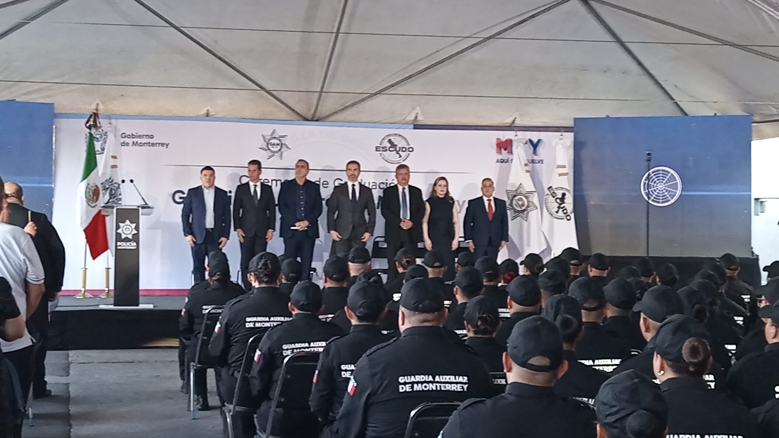 La tarde de este martes se realizó la ceremonia de graduación de la Guardia Auxiliar de Monterrey, con 64 hombres y 40 mujeres, ante la presencia de sus familias, en las instalaciones de la Academia, Formación y Especialización Policial de Monterrey.
