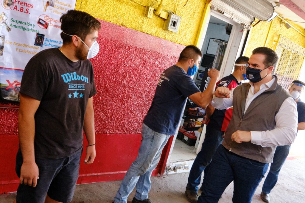 Cumpliendo con las medidas sanitarias, el alcalde Adrián de la Garza Santos entregó cuatro tarjetas bancarias a igual número de trabajadores del negocio dedicado a la reparación de automóviles Xpert Auto Service, ubicado al poniente de Monterrey.