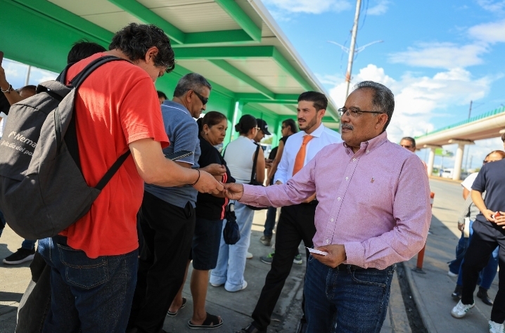 Tras la presentación del Circuito, el Gobernador y el Alcalde abordaron una de las nuevas unidades y viajaron en ella por unos 20 minutos desde la Colonia Fernando Amilpa hasta la Estación del Metro Sendero, donde al bajar entregaron tarjetas Me Muevo a usuarios del transporte.