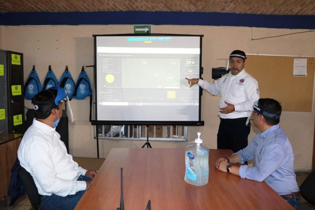 Para mantener la guardia durante la fase 3 de la contingencia por la pandemia mundial del covid-19, el Alcalde de Santa Catarina, Héctor Castillo Olivares, supervisó las labores en el Centro de Comando del Grupo Jaguares, donde se analizaron las estrategias para continuar con los acciones de desinfección en áreas públicas del municipio y los perifoneos para convocar a los vecinos a permanecer en casa.