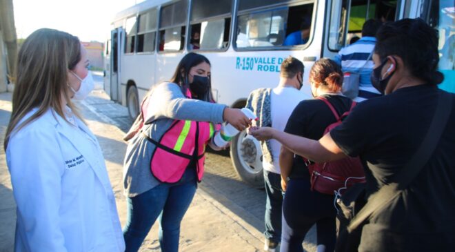 La Alcaldesa Cristina Díaz instruyó a la Directora de Salud municipal, Silvia Muzquiz, supervisar el uso correcto del cubrebocas por parte de usuarios, así como de los choferes de camiones, labor que realizaron en la zona de la Exposición, donde converge un gran número de personas que utilizan el servicio de transporte.