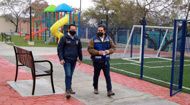 Este espacio público ubicado entre las calles Andador de La Justicia y de Los Garza, beneficiará a familias de las colonias Infonavit Huasteca, Lázaro Cárdenas y Mirador de Santa Catarina, que podrán hacer uso de las instalaciones hasta que termine la pandemia mundial del covid19.