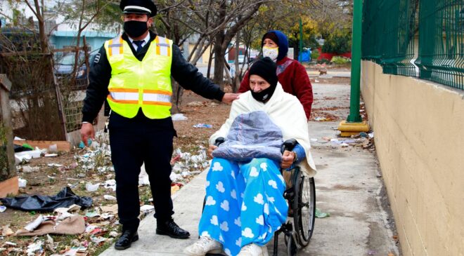 Agentes de tránsito de Guadalupe se sumaron a las acciones para proteger a las familias del frente frío número 26 y entregaron más de 200 cobertores en las colonias Las Sabinas y Campestre la Silla.