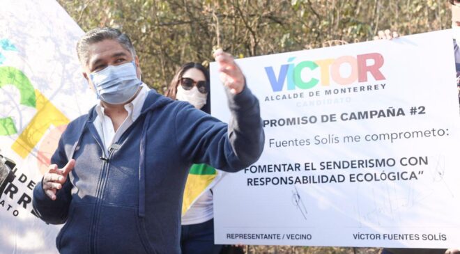 Víctor Fuentes, candidato a la Alcaldía de Monterrey por la Coalición Juntos Haremos Historia en Nuevo León (JHHNL), se comprometió a la creación de un fideicomiso para atender las necesidades de conservación y mantenimiento de los cerros del municipio, en donde los regiomontanos practican el senderismo.